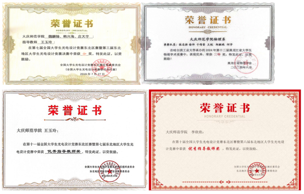 弘扬教育家精神,做教书育人模范,教学上构建以能力培养为导向的物理学专业课程体系,促进理论与实践的深度融合。获评省级教学成果一等奖1项、省级一流课程2门,校级一流课程6门,校级课程思政示范课程3门。专业教师曾获得第三届“智慧树杯”全国课程思政教学竞赛特等奖1项,第五届全国混合式教学设计创新大赛二等奖1项、设计之星奖1项,黑龙江省教学创新大赛一等奖2项、二等奖1项、三等奖1项,黑龙江省微课大赛一等奖1项、二等奖1项、全国物理基础课程青年教师讲课比赛(黑龙江赛区)二等奖3项,黑龙江省青年教师教学大赛三等奖1项、校板书大赛理科组一等奖1项、校课程思政教学大赛一等奖、二等奖各1项。