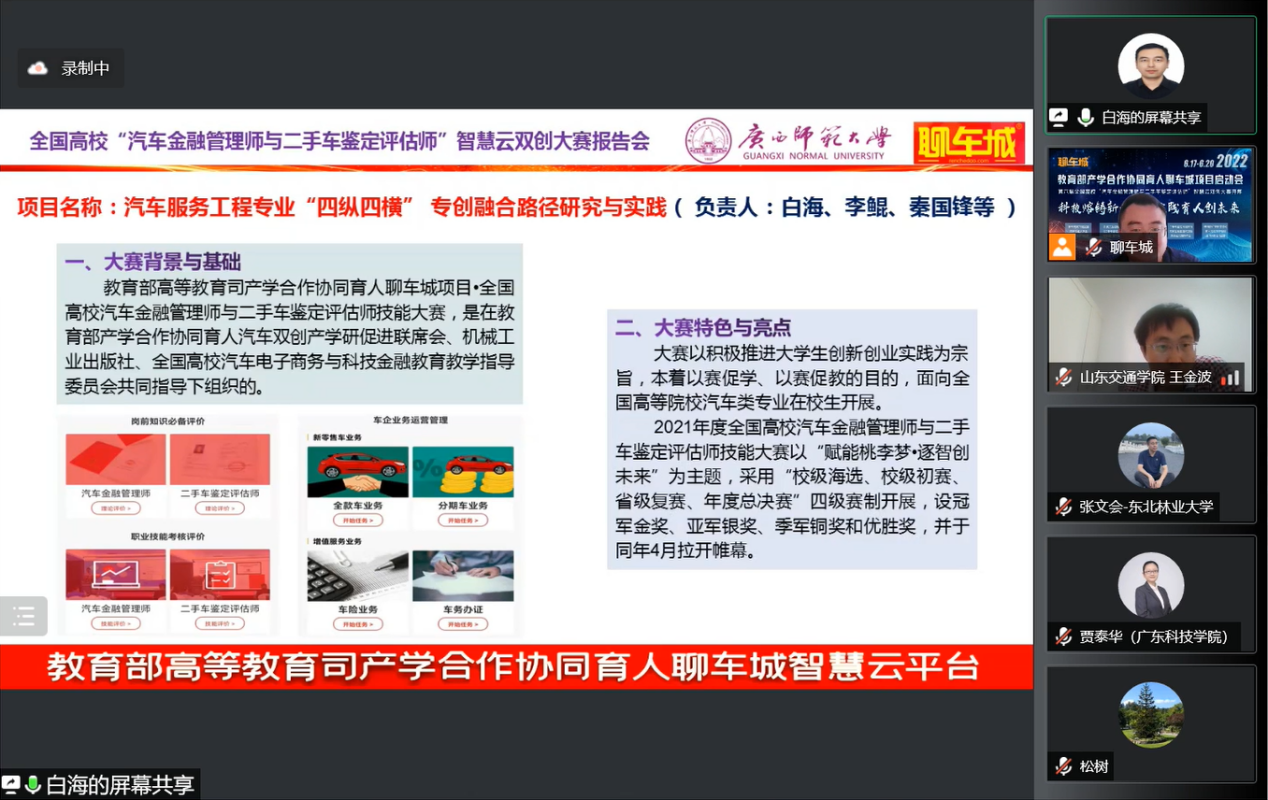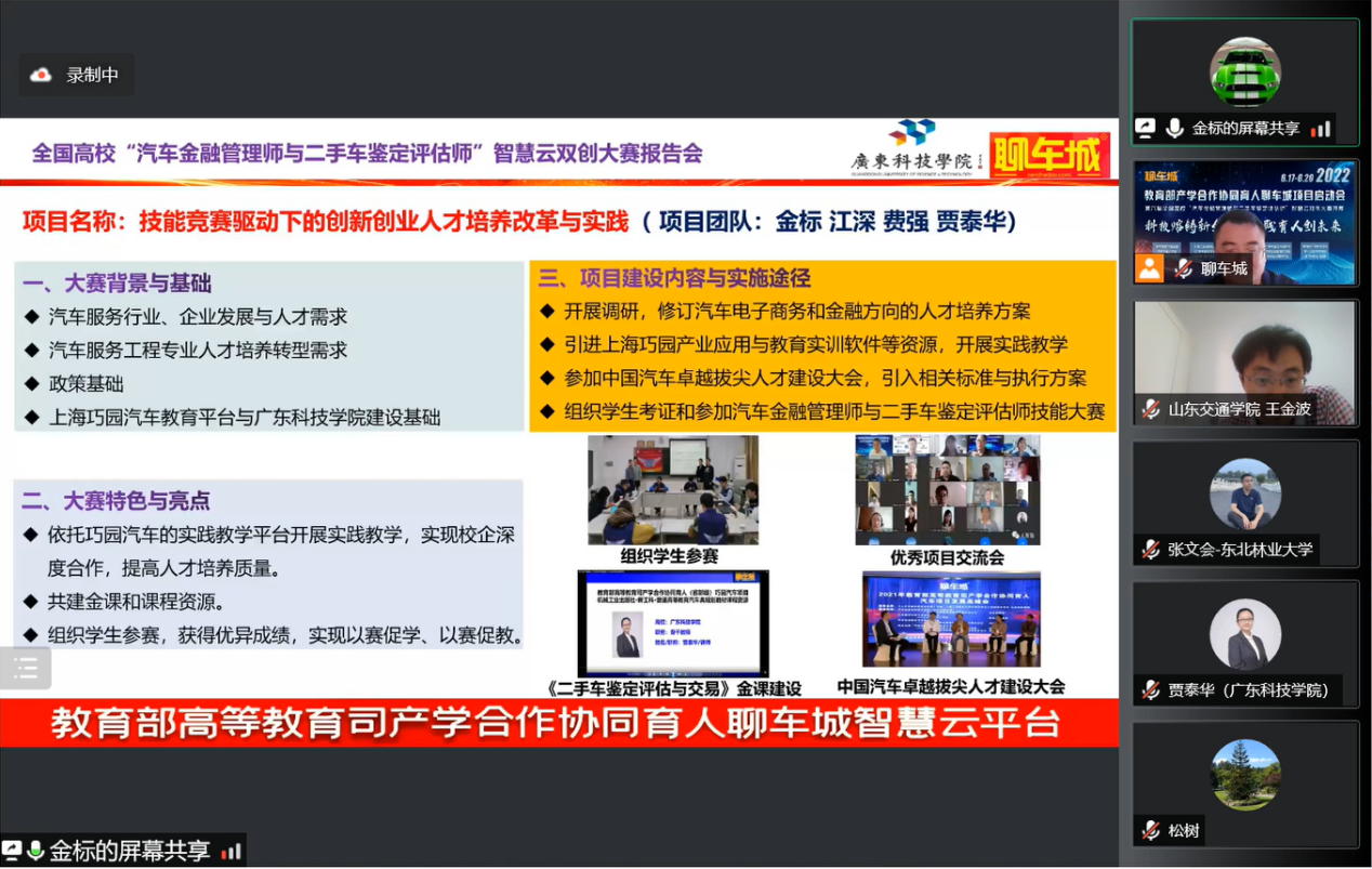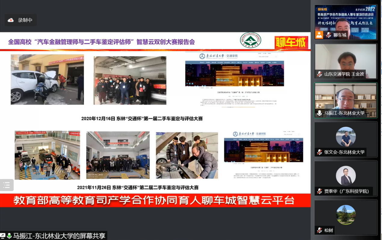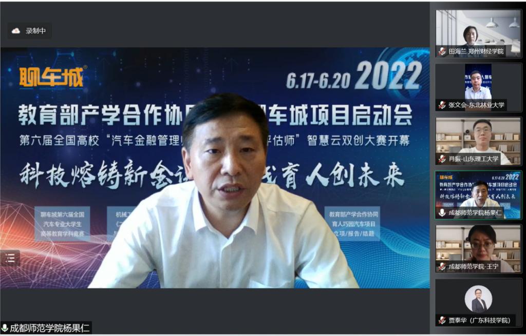 2022年6月18日,教育部产学合作协同育人聊车城项目启动会暨2022年全国高校汽车金融管理师与二手车鉴定评估师智慧云双创大赛开幕式如期举办。本届大会以“线上+线下”相结合的方式举办,线上通过腾讯会议室参会,并在重庆设立主会场。会议主题为“科技熔铸新金课·实践育人创未来”,会议共邀请来自全国各省市61名高校领导、教师及汽车产业学者、行业专家、名企高管参加。公司赵大伟老师、陈巧珍老师代表项目组成员参加了此次盛会,共话育人未来,传递时代强音。