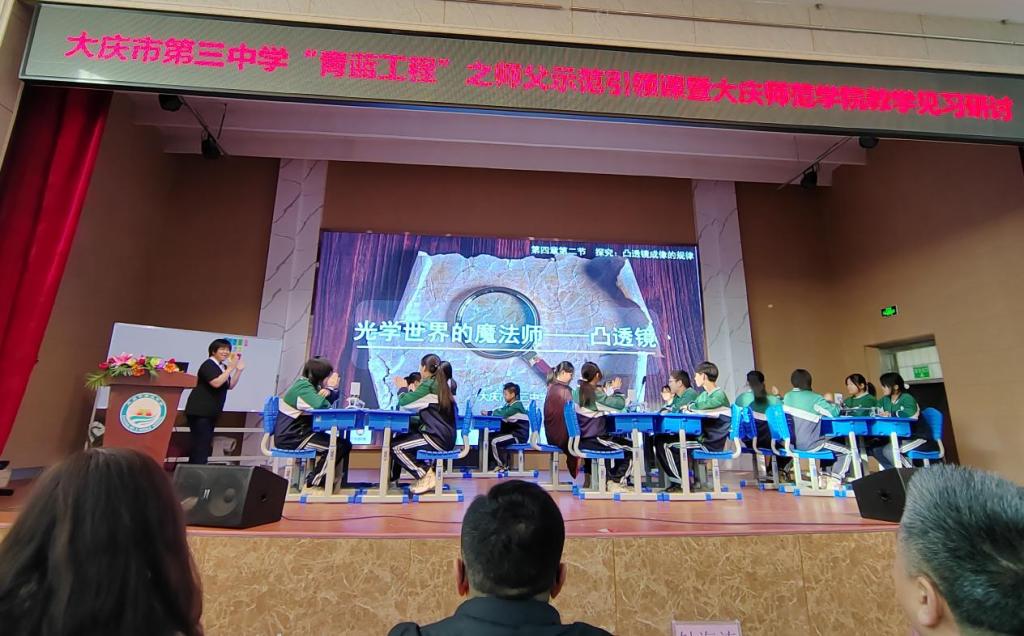 启动会后,王玉玲副经理带领22级物理学专业指导教师及22级物理学专业全体同学赴大庆市第三中学进行教育见习。本次活动大庆市第三中学高度重视、将教育见习与大庆市第三中学“青蓝工程”之师父引领示范课堂活动相结合、大庆市让胡路区教育局副局长钟海涛、让胡路区进修校董事长崔海彬、副董事长潘明浩、大庆市第三中学学董事长高峰、副董事长刘鋆星出席此次活动。精彩的公开课《光学世界的魔法师--凸透镜》在轻松愉悦的氛围中进行,物理学专业师范生收获颇丰,会后物理学专业全体师范生也对本课例的亮点进行交流研讨并形成教学设计方案以提升教学技能做到学以致用。